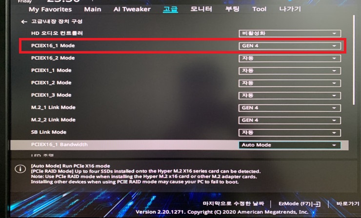 결론: 라이저 케이블을 PCI 3.0 제품을 사용중이면 메인보드 설정에서 PCI 슬롯 버전을 Gen 3로 설정하기