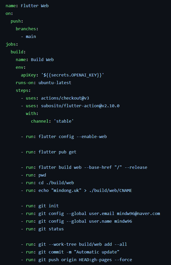 모든 코드는 Flutter를 사용해서 만들었으며 Github Actions을 이용하여 자동으로 빌드 및 배포하도록 작성하였다.
