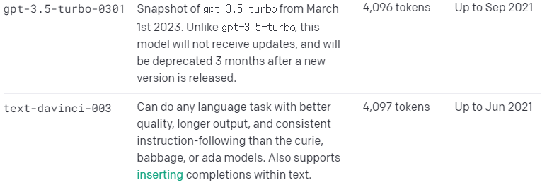 gpt-3.5와 text-davinci의 차이는 다음과 같은데 간단히 말해서 gpt-3.5는 가격이 저렴하고 text-davinci는 더 비싼대신 정확하고 길게 나온다.