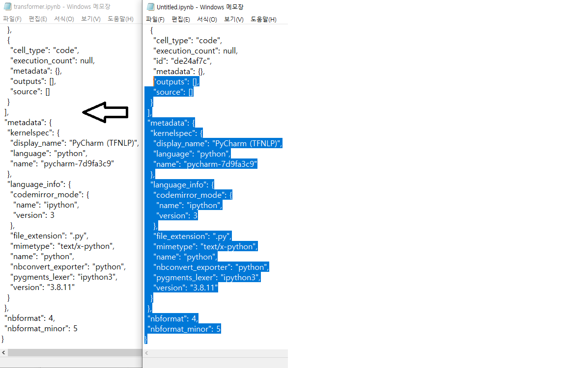 2. 실행이 안되는 ipynb 파일과 새로 만든 ipynb 파일을 메모장으로 실행한다.